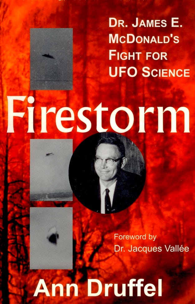 For the history of James E. McDonald - the rigorous academic, the intrepid investigator, and fearless crusader for UFO disclosure, start with Ann Druffel’s seminal biography, Firestorm: Dr. James E. McDonald’s Fight for UFO Science. It’s worth mentioning that while still alive, Ann Druffel, a very important figure in Ufology in her own right, helped organize and ensure the preservation of McDonald’s extensive UFO files and research in an archive at the University of Arizona, an achievement that we may not know the full value of for many years…or. maybe sooner?